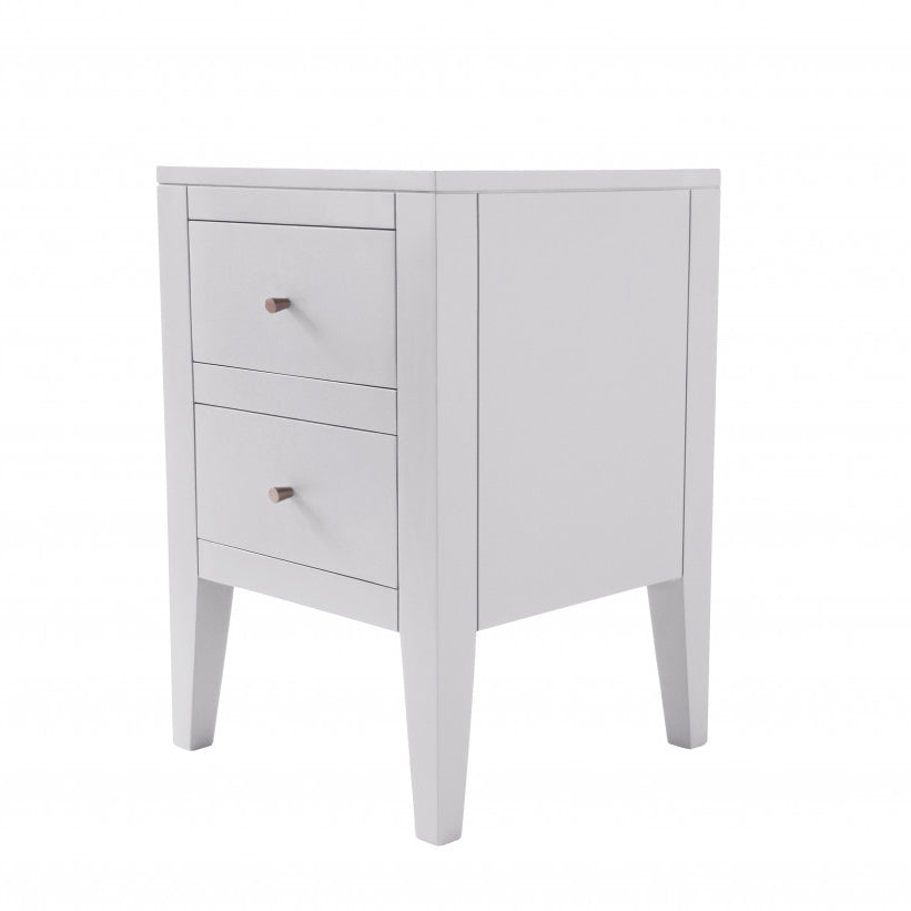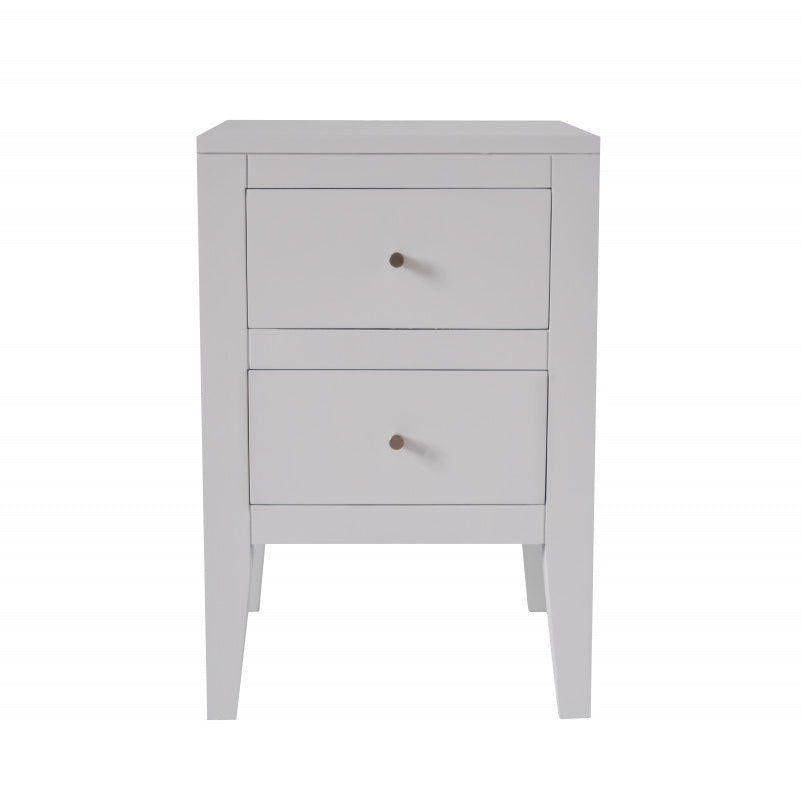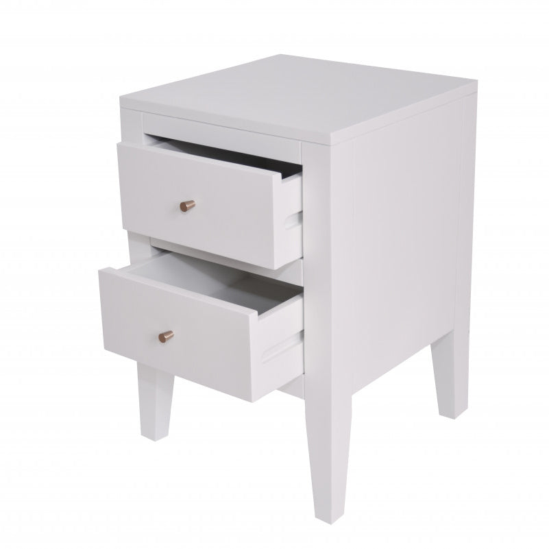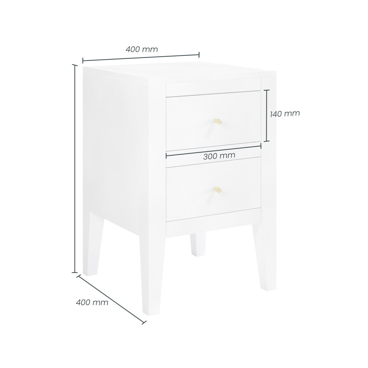 The white finish brightens up your space, while the tapered legs, detailed cut lines, and brass-style handles add sophisticated touches. With two spacious drawers on smooth wooden runners, it’s both stylish and functional, providing ample room for all your nighttime essentials.