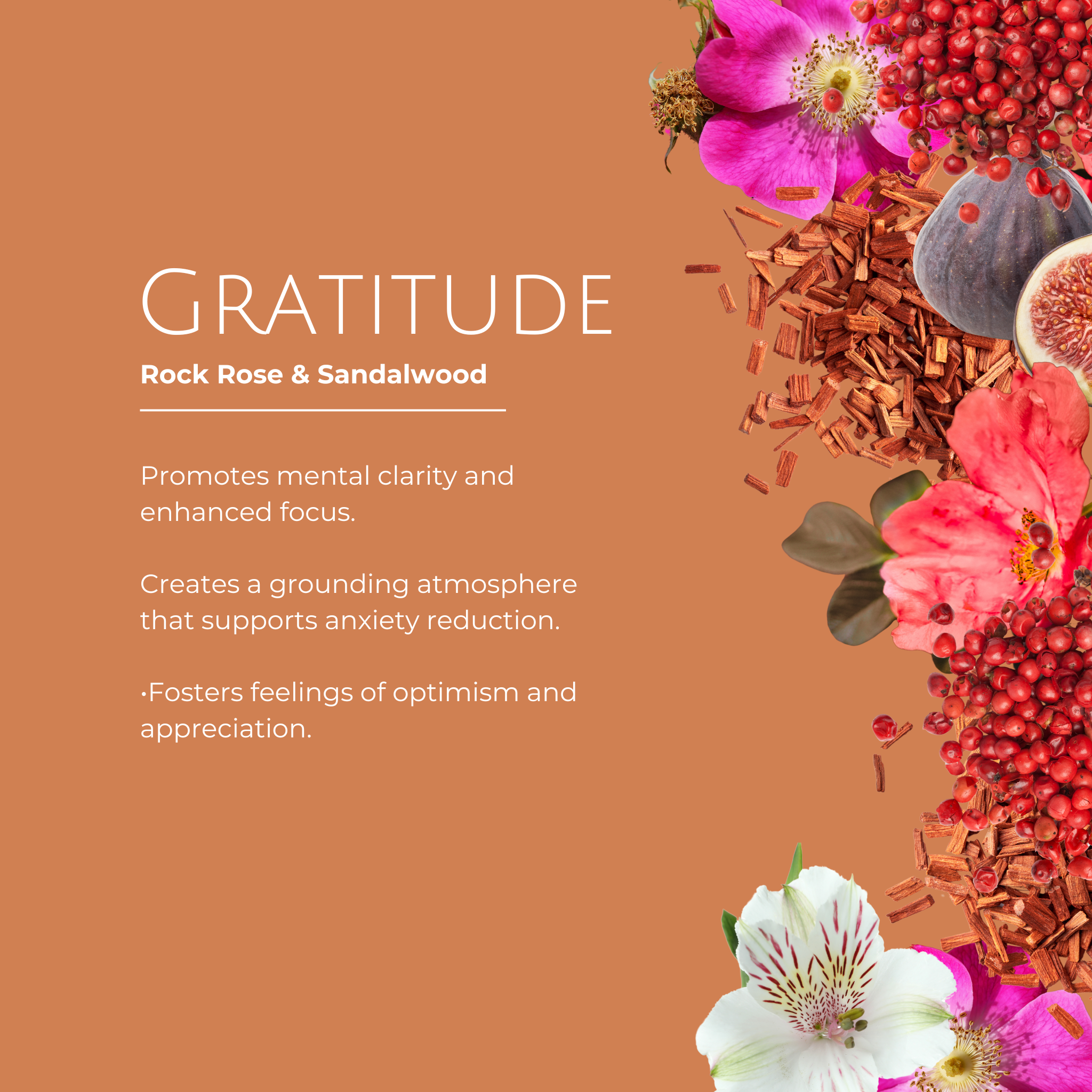 Create space for intention with Gratitude - a rich, earthy floral blend of rock rose, sandalwood, and warm spice.