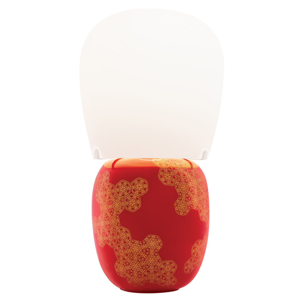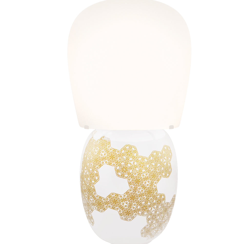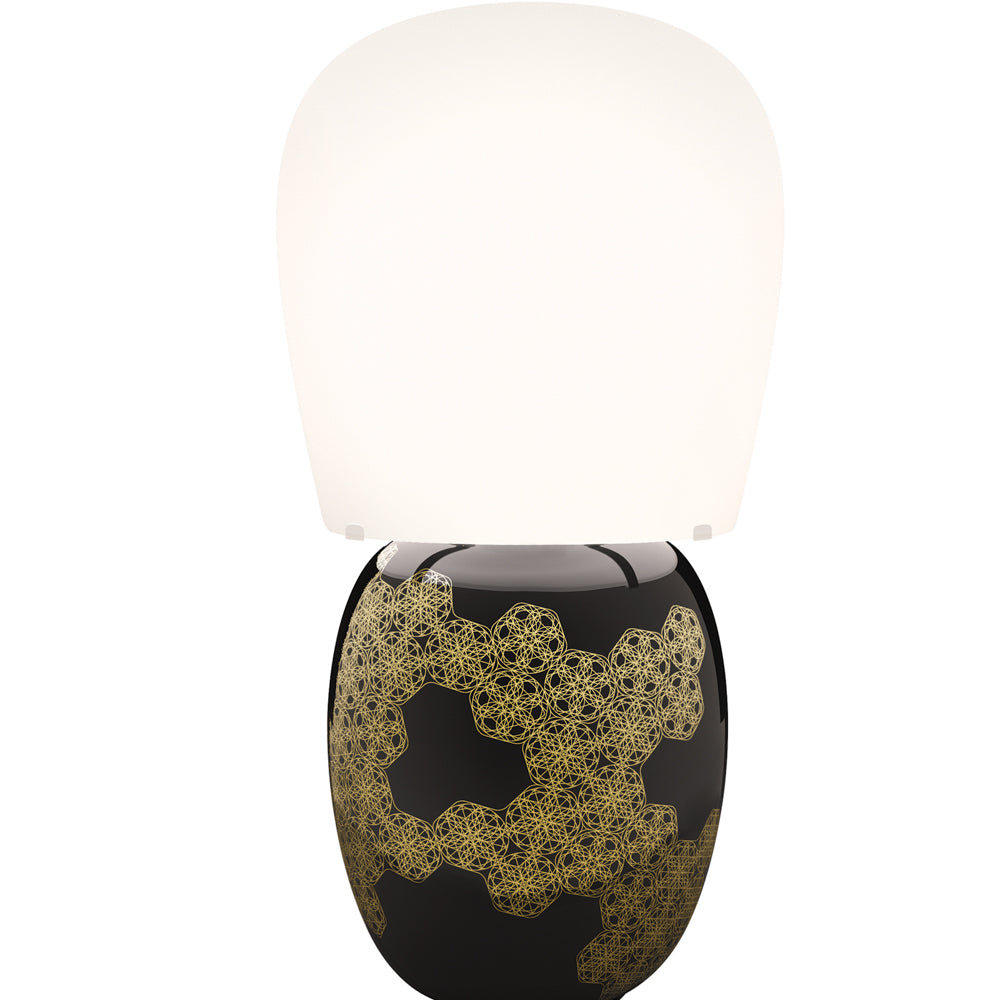 The Hive Table Lamp by Ini Archibong is a beautiful fusion of art and function, bringing a touch of modern elegance to your space. The lamp features an opalescent diffuser crafted from two layers of mouth-blown glass, delivering a soft, ambient glow that creates a cozy and inviting atmosphere. The enamel ceramic body, finished in white, black, or red with a distinctive gold decor, is created using the meticulous "third firing” technique, making each piece a true work of art.