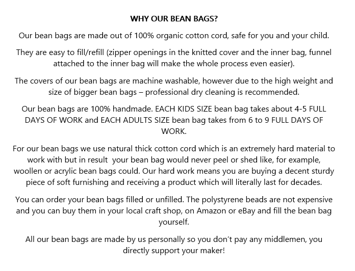 • Due to the high overall volumetric weight (which means higher shipping costs) the bean bags can be also sent unfilled - you can choose this option in the drop menu