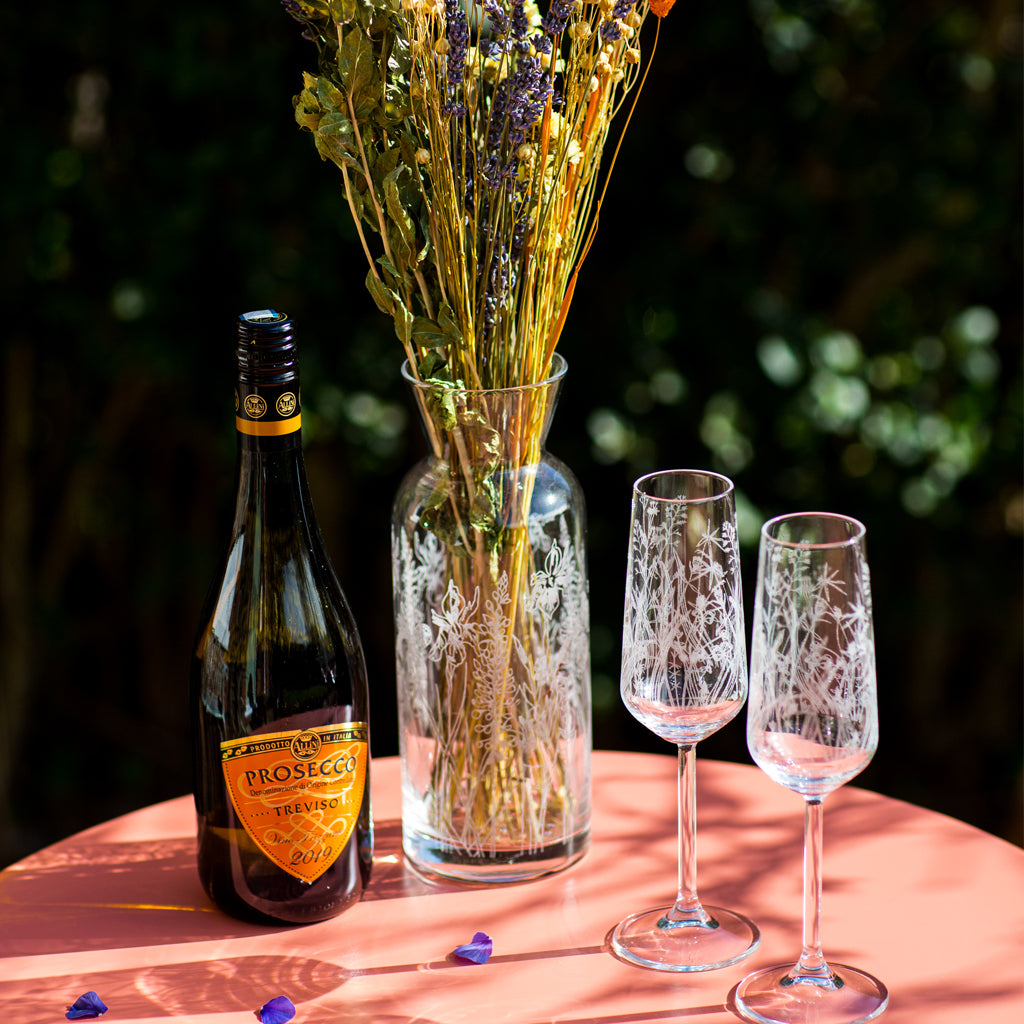 Each glass is designed, decorated and hand-finished in Emma’s studio in England, featuring her original Meadow design. Inspired by British wildflower meadows, the intricate etching showcases seed heads, grasses, and even a butterfly - a tribute to the biodiversity that allows UK flora and fauna to thrive.